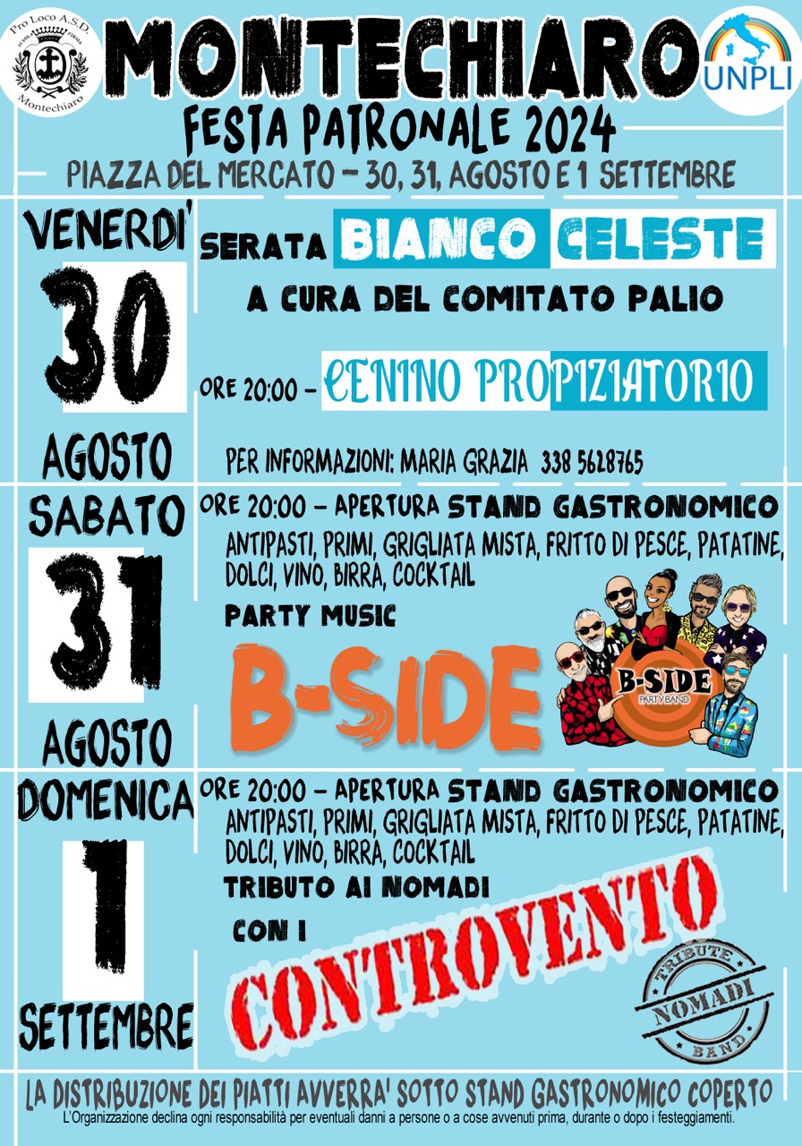 Durante tutto l'anno, la nostra Pro Loco si impegna nell'organizzazione di vari eventi che vanno oltre le festività specifiche. Dalle sagre alle manifestazioni culturali, ci sono tante opportunità per vivere l'autenticità e la vivacità di Montechiaro. Restate aggiornati sulle nostre iniziative, perché ogni stagione è un'occasione per scoprire la bellezza e la tradizione che caratterizzano la nostra comunità.